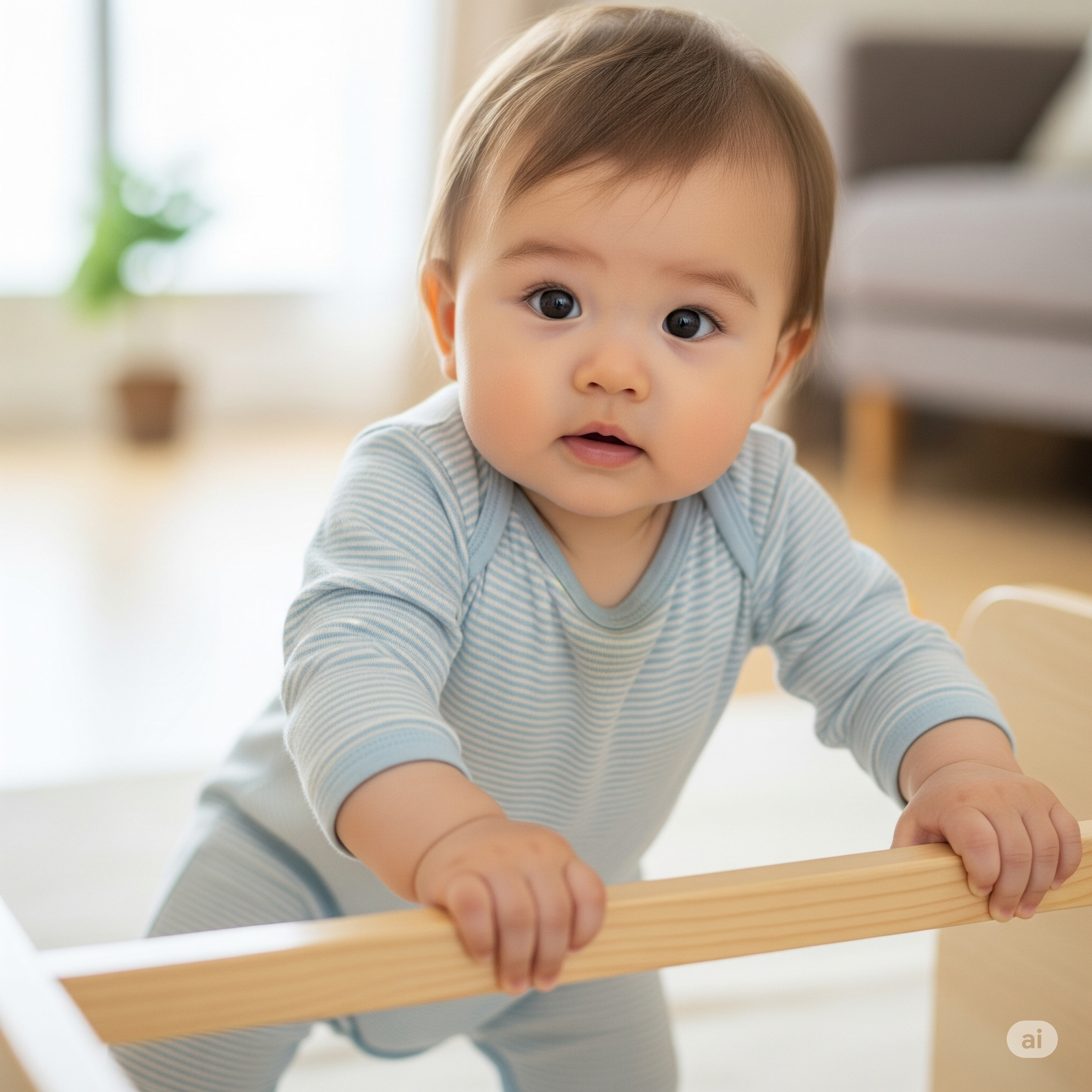 8ヶ月までは支えながらよっこいしょと持ち上げるとフラフラでお尻を引いた状態でなんとか立てる、という状態だったのが、今では自分でソファを掴んで立ちあがることができるようになった